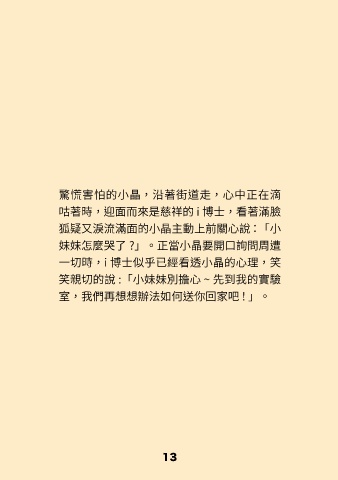 驚慌害怕的小晶,沿著街道走,心中正在滴 咕著時,迎面而來是慈祥的 i 博士,看著滿臉 狐疑又淚流滿面的小晶主動上前關心說:「小 妹妹怎麼哭了 ?」。正當小晶要開口詢問周遭 一切時,i 博士似乎已經看透小晶的心理,笑 笑親切的說 :「小妹妹別擔心 ~ 先到我的實驗 室,我們再想想辦法如何送你回家吧 ! 」。 13