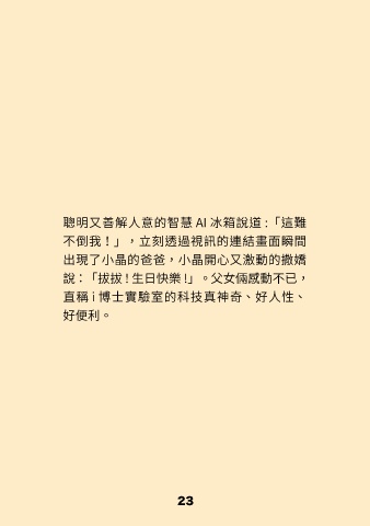 聰明又善解人意的智慧 AI 冰箱說道 :「這難 不倒我!」,立刻透過視訊的連結畫面瞬間 出現了小晶的爸爸,小晶開心又激動的撒嬌 說:「拔拔 ! 生日快樂 !」。父女倆感動不已, 直稱 i 博士實驗室的科技真神奇、好人性、 好便利。 23