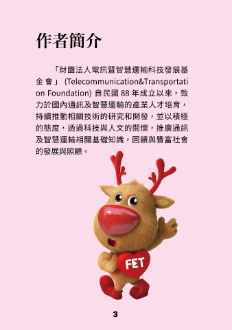 作者簡介 「財團法人電訊暨智慧運輸科技發展基 金 會 」 (Telecommunication&Transportati on Foundation) 自民國 88 年成立以來,致 力於國內通訊及智慧運輸的產業人才培育, 持續推動相關技術的研究和開發,並以積極 的態度,透過科技與人文的關懷,推廣通訊 及智慧運輸相關基礎知識,回饋與豐富社會 的發展與照顧。 3