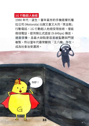 1G 行動超人始祖 1980 年代,誕生。當年最夯的手機是摩托羅 拉公司 (Motorola) 出廠又重又大的『黑金剛』 行動電話。1G 行動超人始祖受限技術,僅能 撥接電話,提供類比式語音 (9.6Kbps) 傳送, 速度很慢,且最大缺點是容易被監聽與門號 複製,所以當年代最常聽到『王八機』存在, 成為社會治安漏洞。 1 你好! 33