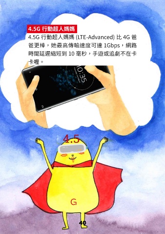 4.5G 行動超人媽媽 4.5G 行動超人媽媽 (LTE-Advanced) 比 4G 爸 爸更棒,她最高傳輸速度可達 1Gbps,網路 時間延遲縮短到 10 毫秒,手遊或追劇不在卡 卡喔。 4.5 G 40