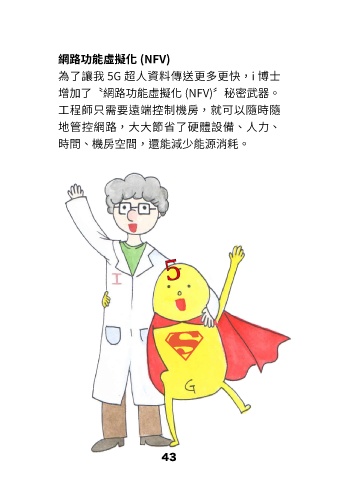 網路功能虛擬化 (NFV) 為了讓我 5G 超人資料傳送更多更快,i 博士 增加了〝網路功能虛擬化 (NFV)〞秘密武器。 工程師只需要遠端控制機房,就可以隨時隨 地管控網路,大大節省了硬體設備、人力、 時間、機房空間,還能減少能源消耗。 5 43