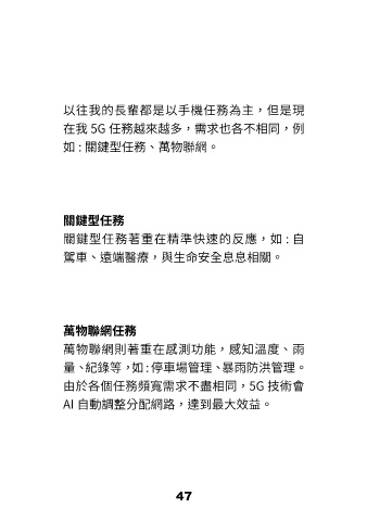 以往我的長輩都是以手機任務為主,但是現 在我 5G 任務越來越多,需求也各不相同,例 如 : 關鍵型任務、萬物聯網。 關鍵型任務 關鍵型任務著重在精準快速的反應,如 : 自 駕車、遠端醫療,與生命安全息息相關。 萬物聯網任務 萬物聯網則著重在感測功能,感知溫度、雨 量、紀錄等,如:停車場管理、暴雨防洪管理。 由於各個任務頻寬需求不盡相同,5G 技術會 AI 自動調整分配網路,達到最大效益。 47