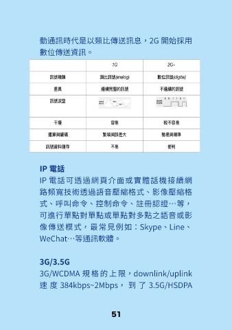 動通訊時代是以類比傳送訊息,2G 開始採用 數位傳送資訊。 IP 電話 IP 電話可透過網頁介面或實體話機接續網 路頻寬技術透過語音壓縮格式、影像壓縮格 式、呼叫命令、控制命令、註冊認證…等, 可進行單點對單點或單點對多點之語音或影 像傳送模式,最常見例如:Skype、Line、 WeChat…等通訊軟體。 3G/3.5G 3G/WCDMA 規 格 的 上 限,downlink/uplink 速 度 384kbps~2Mbps, 到 了 3.5G/HSDPA 51