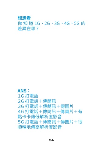 想想看 你 知 道 1G、2G、3G、4G、5G 的 差異在哪 ? ANS: 1G 打電話 2G 打電話+傳簡訊 3G 打電話+傳簡訊+傳圖片 4G 打電話+傳簡訊+傳圖片+有 點卡卡傳低解析度影音 5G 打電話+傳簡訊+傳圖片+很 順暢地傳高解析度影音 54