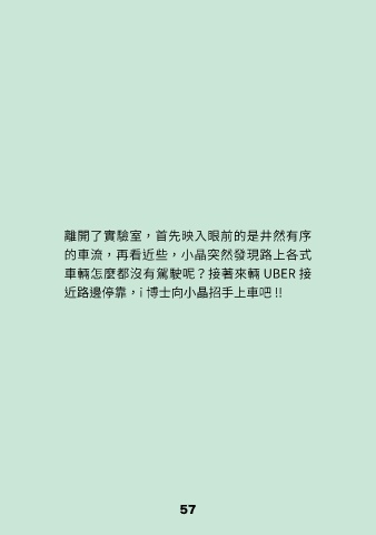 離開了實驗室,首先映入眼前的是井然有序 的車流,再看近些,小晶突然發現路上各式 車輛怎麼都沒有駕駛呢?接著來輛 UBER 接 近路邊停靠,i 博士向小晶招手上車吧 !! 57