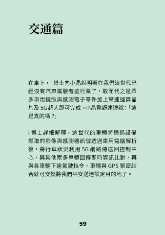 交通篇 在車上,i 博士向小晶說明著在我們這世代已 經沒有汽車駕駛者這行業了,取而代之是眾 多車用鏡頭與感測電子零件加上高速運算晶 片及 5G超人即可完成。小晶驚訝連連說:「這 是真的嗎 ?」 i 博士詳細解釋,這世代的車輛將透過設備 擷取的影像與感測器訊號透過車用電腦解析 後,將行車狀況利用 5G 網路傳送回控制中 心,與其他眾多車輛回傳即時資訊比對,再 與各車輛下達駕駛指令,車輛與 GPS 緊密結 合就可安然將我們平安送達設定目的地了。 59