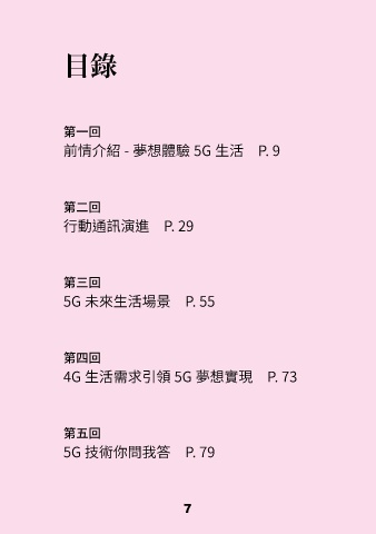 目錄 第一回 前情介紹 - 夢想體驗 5G 生活 P. 9 第二回 行動通訊演進 P. 29 第三回 5G 未來生活場景 P. 55 第四回 4G 生活需求引領 5G 夢想實現 P. 73 第五回 5G 技術你問我答 P. 79 7