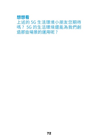 想想看 上述的 5G 生活環境小朋友您期待 嗎 ? 5G 的生活環境還能為我們創 造那些場景的運用呢 ? 72