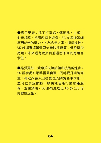 ●應用更廣:除了打電話、傳簡訊、上網、 影音服務、視訊和線上遊戲,5G 有與物聯網 應用結合的潛力,也包含無人車、遠端遙控、 VR 虛擬實境等需要大量快速運算、低延遲的 應用,未來還有更多目前還想不到的應用會 發生! ●品質更好:受惠於天線設備和技術的進步, 5G 將會提升網路覆蓋範圍,同時提升網路容 量,有效改善人口密集區的網路塞車情形, 並可在高速移動下順暢地使用行動網路服 務,整體預期,5G 將能處理比 4G 多 100 倍 的數據流量。 84