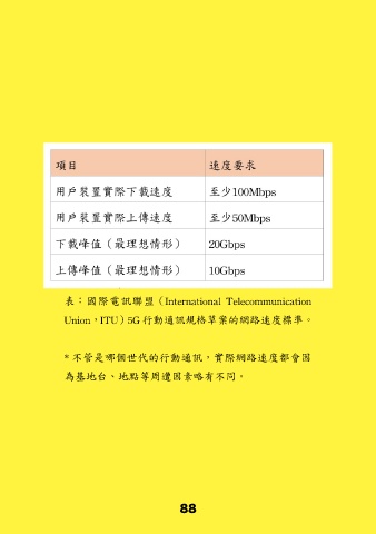 表:國際電訊聯盟(International Telecommunication Union,ITU)5G 行動通訊規格草案的網路速度標準。 * 不管是哪個世代的行動通訊,實際網路速度都會因 為基地台、地點等周遭因素略有不同。 88