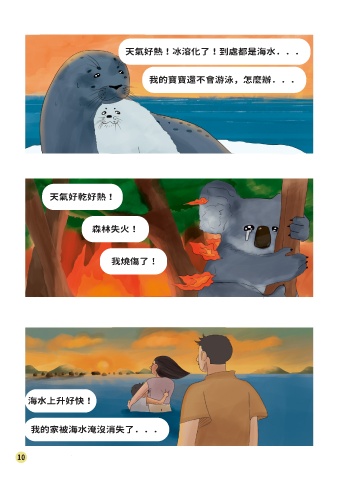 天氣好熱!冰溶化了!到處都是海水... 我的寶寶還不會游泳,怎麼辦... 天氣好乾好熱! 真著急...! 森林失火! 我們遇上大麻煩了! 我燒傷了 ! 海水上升好快! 我的家被海水淹沒消失了... 10 11