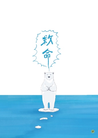 近來新聞媒體報導,北極氣溫上升,冰層融化近台灣 40 多倍 大面積。原依附冰層的海獅海豹因冰層變少了數量也減少了; 海水面積因冰化了而變大了,北極熊為了覓食只能不斷游泳找 尋海獅海豹,最終因體力耗盡淹死於海中。 16 17