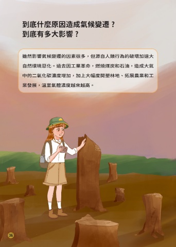 到底什麼原因造成氣候變遷 ? 到底有多大影響 ? 雖然影響氣候變遷的因素很多,但源自人類行為的破壞加速大 依聯合國政府間氣候變遷專門委員會 (IPCC) 於 2013 年報告: 自然環境惡化。過去因工業革命,燃燒煤炭和石油,造成大氣 「超過 95% 的機率顯示,人類行為是過去 50 年造成暖化現 中的二氧化碳濃度增加,加上大幅度開墾林地、拓展農業和工 象的主要原因。」 業發展,溫室氣體濃度越來越高。 36 37