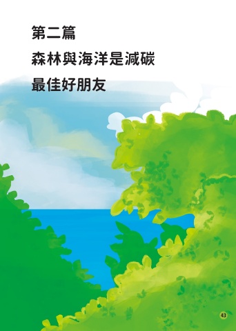 第二篇 除此之外,極端天氣造成世界各地熱浪、乾旱、森林大火、暴 雨、水患、暴雪等,嚴重危害生命與財產損失,衝擊生態,引 森林與海洋是減碳 起大規模物種滅絕,及糧食危機,動盪全球經濟,引發爭奪資 源的世界戰爭。 最佳好朋友 42 43