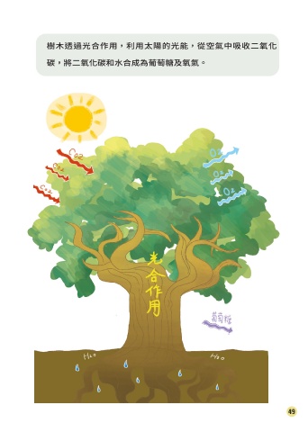 森林是陸地生態系統的要角,一般而言,大部分的二氧化碳都 樹木透過光合作用,利用太陽的光能,從空氣中吸收二氧化 可以被植物體吸收。協助我們對抗日趨惡化的氣候異常、暖化 碳,將二氧化碳和水合成為葡萄糖及氧氣。 問題。 48 49