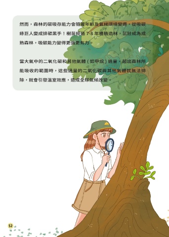然而,森林的碳吸存能力會隨著年齡及氣候環境變遷,從吸碳 綠巨人變成排碳黑手!樹苗經過 7-8 年種植造林,茁壯成為成 熟森林,吸碳能力變得更強更有力。 當大氣中的二氧化碳和其他氣體 ( 如甲烷 ) 過量,超出森林所 能吸收的範圍時,這些過量的二氧化碳與其他氣體就無法排 除,就會引發溫室效應,造成全球氣候改變。 但樹也會年老枯死,也會隨乾旱、水災、 火災及地震等環境因素受傷、生病、死 亡,導致森林吸碳能力下降,從吸碳者 變成排碳者狀況。 52 53
