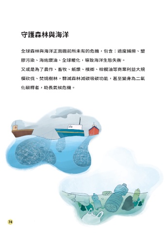 守護森林與海洋 全球森林與海洋正面臨前所未有的危機,包含:過度捕撈、塑 如此惡性循環,導致環境更乾燥,氣候更異常,大火難以撲滅, 膠污染、海底鑽油、全球暖化,導致海洋生態失衡。 製造更多二氧化碳。 又或是為了農作、畜牧、紙漿、檳榔、棕櫚油等商業利益大規 因此制定有效的保護法規,守護森林和海洋以減緩氣候變遷, 模砍伐、焚燒樹林,驟減森林減碳吸碳功能,甚至變身為二氧 就是保地球,保護我們自己。 化碳釋者,助長氣候危機。 74 75