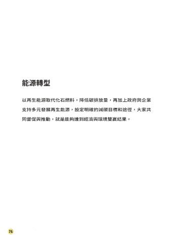 能源轉型 以再生能源取代化石燃料,降低碳排放量,再加上政府與企業 支持多元發展再生能源,設定明確的減碳目標和途徑,大家共 同督促與推動,就是能夠達到經濟與環境雙贏結果。 76 77