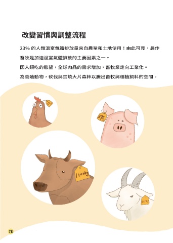 改變習慣與調整流程 23% 的人類溫室氣體排放量來自農業和土地使用!由此可見,農作 畜牧是加速溫室氣體排放的主要因素之一。 因人類吃的慾望,全球肉品的需求增加,畜牧業走向工業化。 為養殖動物,砍伐與焚燒大片森林以騰出畜牧與種植飼料的空間。 78 79