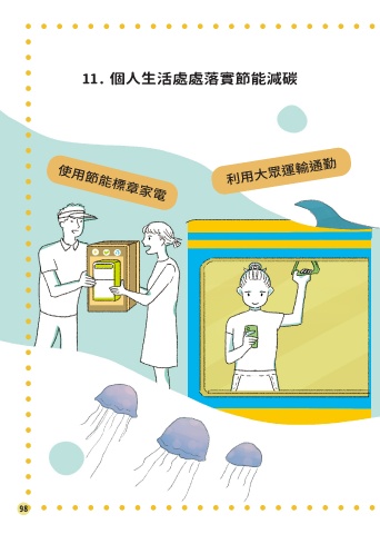 11. 個人生活處處落實節能減碳 利用大眾運輸通勤 使用節能標章家電 支持政府氣候與能源政策 自備可重複使用容器 拒用塑膠製品, 98 99