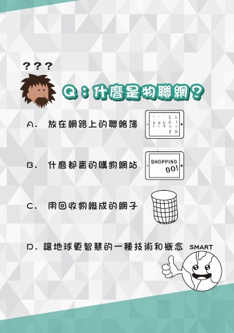 ??? 第一章 什麼是物聯網 Q:什麼是物聯網? ˙物聯網的一天 A. 放在網路上的聯絡簿 ˙物聯網是什麼? B. 什麼都賣的購物網站 ˙物聯網怎麼來的? C. 用回收物織成的網子 D. 讓地球更智慧的一種技術和概念 SMART