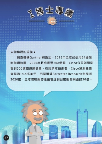 ˙物聯網的規模˙ 調查機構Gartner則指出,2016年全球已使用64億個 物聯網裝置,2020年將成長至208億個,Cisco公司則預測 會到500億個連網裝置,從經濟效益來看,Cisco預測產值 會超過14.4兆美元,市調機構Forrester Research則預測 2020前,全球物聯網的產值會達到目前網際網路的30倍。 狼牙棒加上 感測器再連 上網,也是 物物相連 物聯網的一 「聯」「網」 員! 「物」 IOT 未來世界會有越來 越多人、事、物連 上網路喔! 27 28