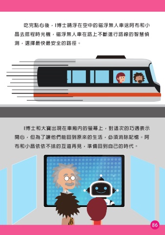體重,自動調整成最舒服的狀態, 晶去搭程時光機,磁浮無人車在路上不斷進行路線的智慧偵
